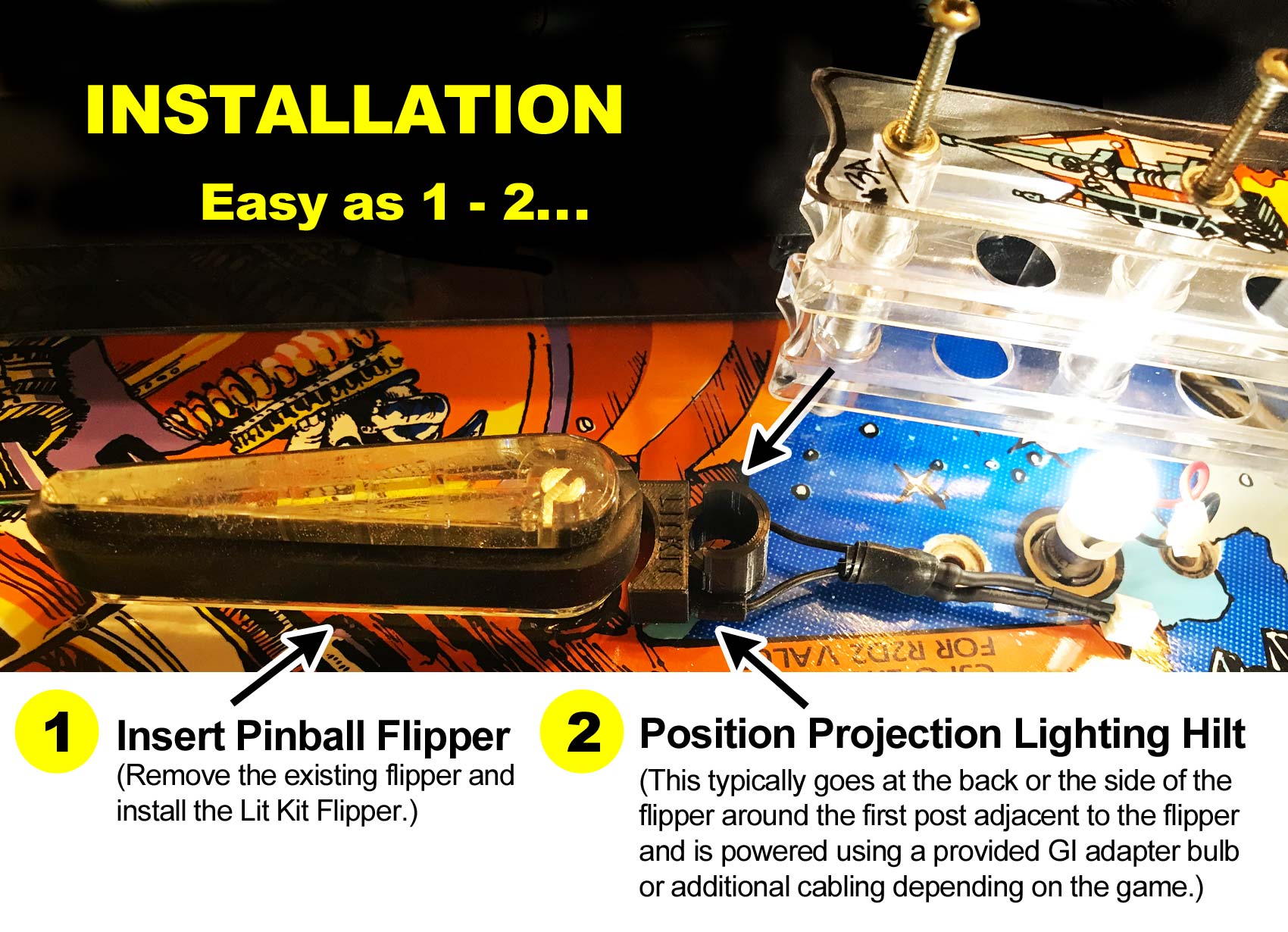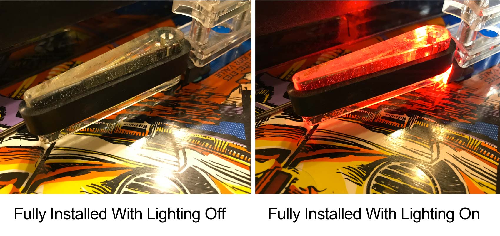 Enjoy a new level of interactivity. Lit Kit Flippers make for dazzling light displays and increased playfield notification and visibility. They can enhance GI lighting when targets have been hit and new game modes begin. See the video below for examples.